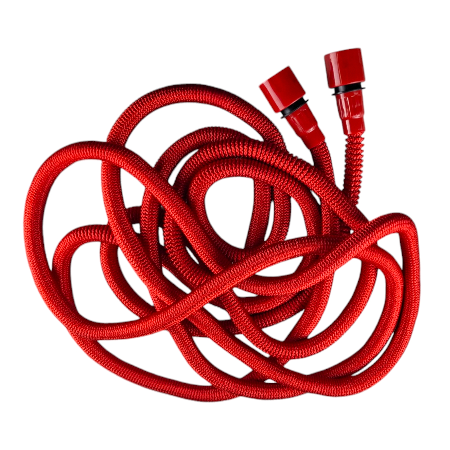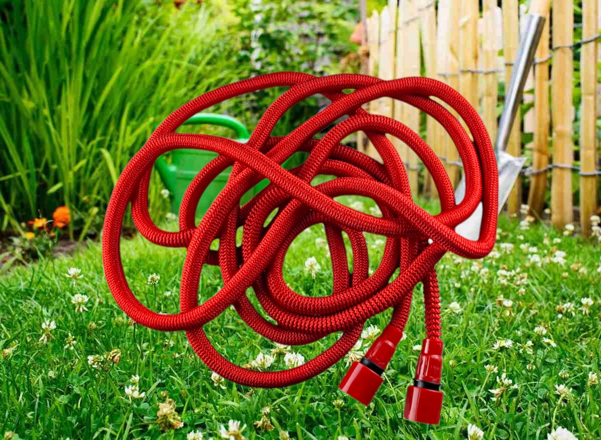 Садовый шланг для полива имеет растягивающуюся конструкцию и состоит из трех слоев: термопластического эластомера, прорезиненных колец и нейлоновой оболочки. Необходимое давление 6 бар. В комплекте со шлангом распылитель воды с семью режимами.